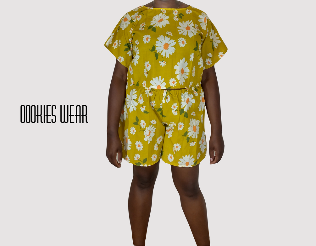 Lounge Wear Set T-shirt and Shorts, Daisy pattern 100 % cotton fabric.